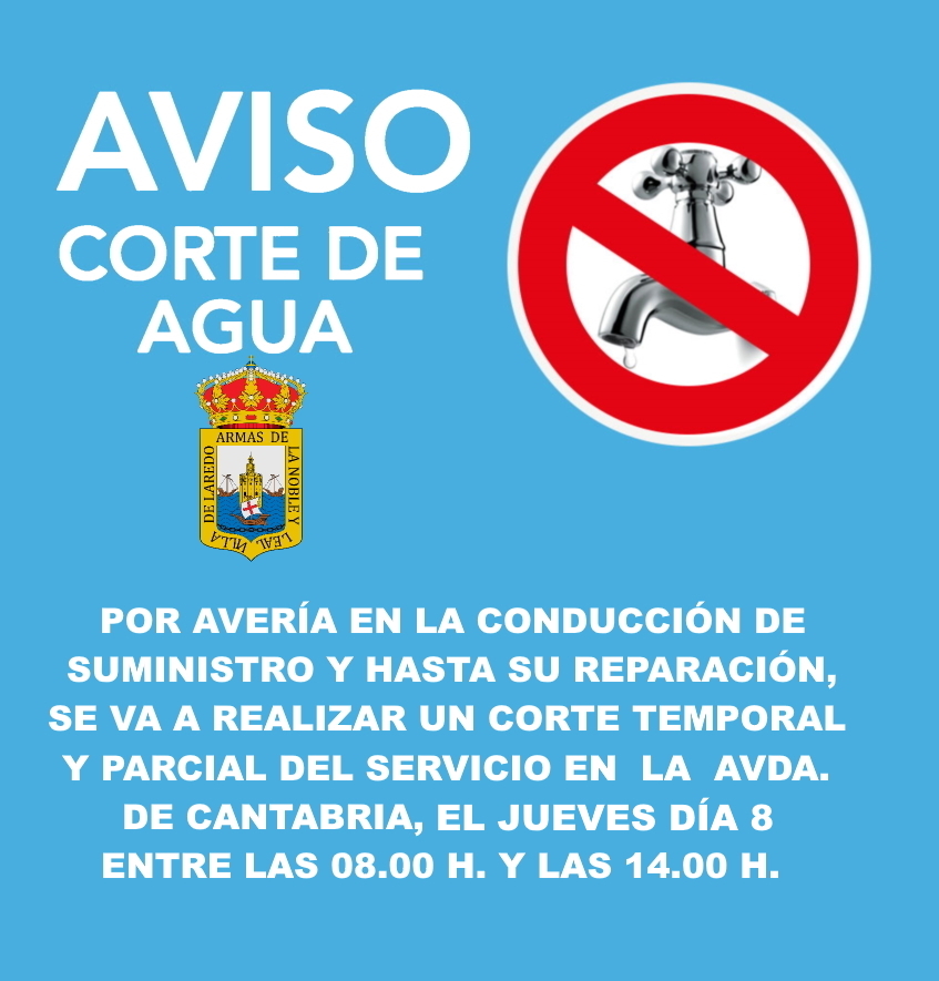 POR AVERÍA EN LA CONDUCCIÓN DE SUMINISTRO Y HASTA SU REPARACIÓN, SE VA A REALIZAR UN CORTE TEMPORAL Y PARCIAL DEL SERVICIO EN LA AVENIDA DE CANTABRIA, EL JUEVES DÍA 8 ENTRE LAS 08:00 HORAS Y LAS 14:00 HORAS