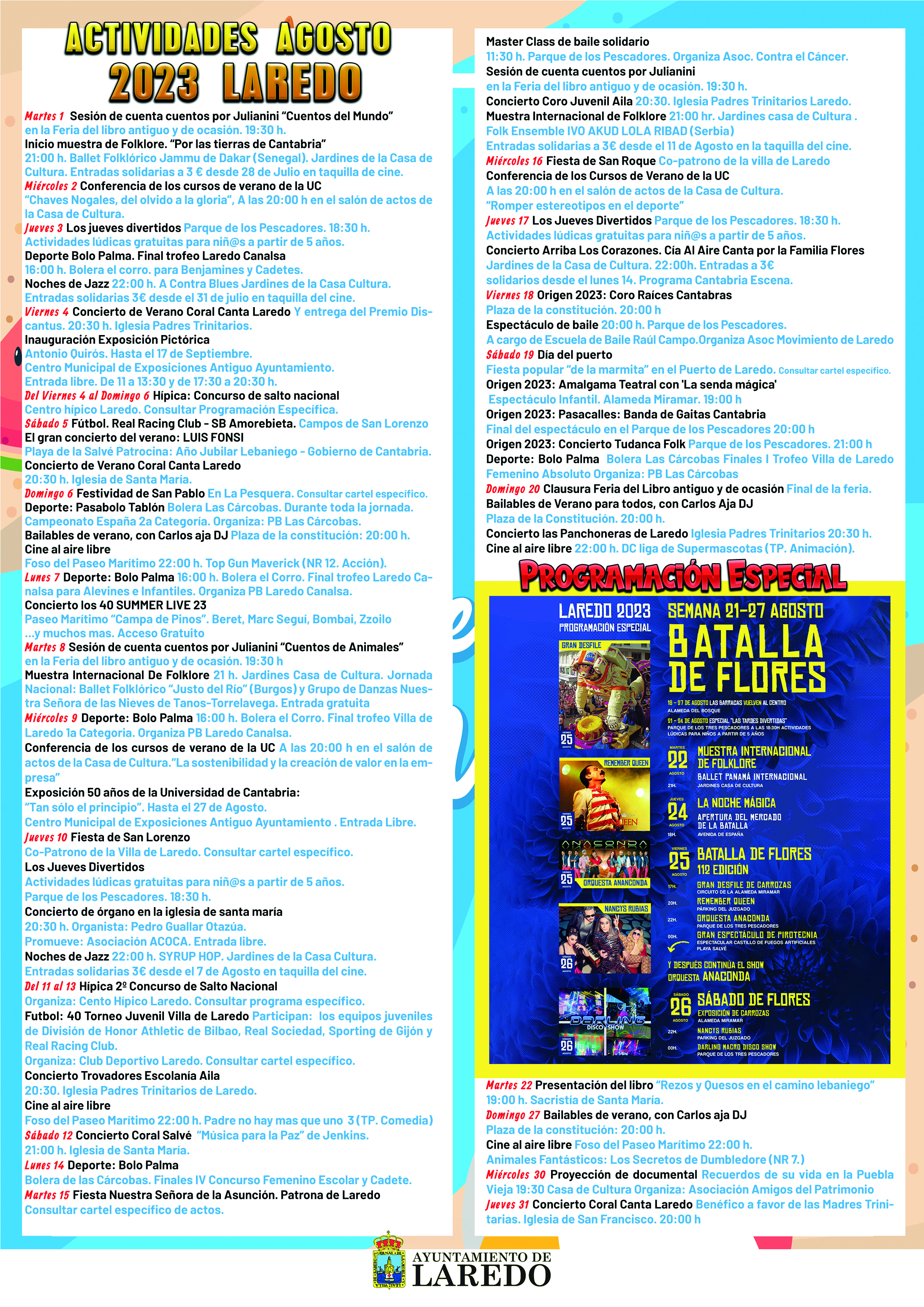 Por otro lado, Laredo será el escenario de muchas otras actividades enfocadas a todo tipo de público durante este mes y el siguiente. Vuelven las barracas al centro de Laredo, actuaciones en directo, conferencias, presentaciones de libros, concursos de hípica y fútbol, exposiciones como la dedicada al pintor Antonio Quirós, cine, cuentacuentos, bolo palma, bailables de verano, la festividad popular de “La Marmita”, el Campeonato del Mundo de Pesca Submarina y, por último, ‘El Último Desembarco de Carlos V’.