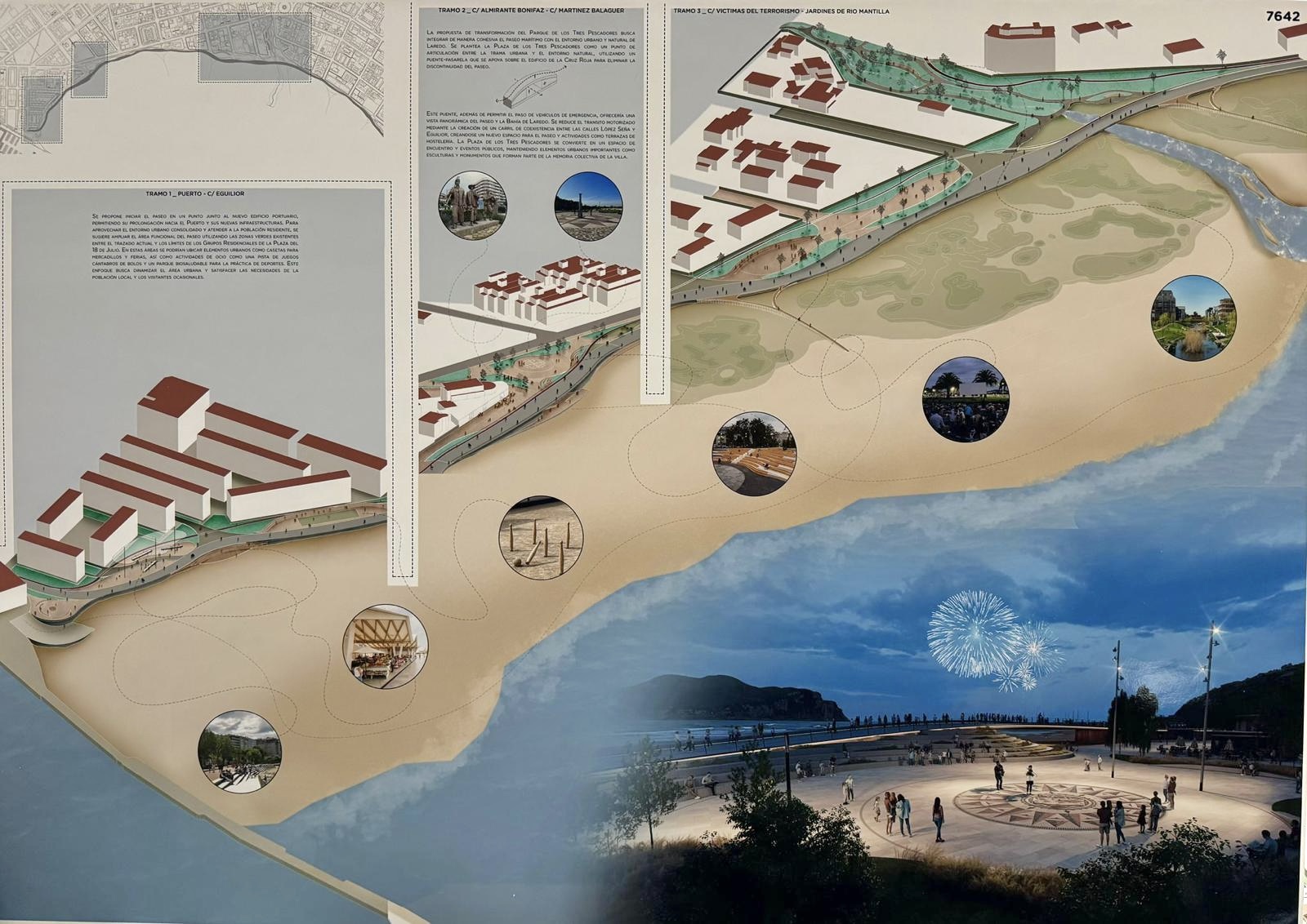 En el Parque de los Tres Pescadores, se plantea establecer este espacio como punto de articulación entre la trama urbana y el entorno natural utilizando un puente-pasarela que se apoya sobre la sede de la Cruz Roja con el fin de eliminar la discontinuidad del paseo. Dicho puente, además de permitir el paso de vehículos de emergencia, ofrecería una vista panorámica del paseo y de la bahía. La plaza de dicho parque se convertiría en un espacio de encuentro y eventos públicos. Además, se mantendrían las esculturas y los monumentos que forman parte de la memoria colectiva de la villa y se instalarían unas gradas a modo de anfiteatro.