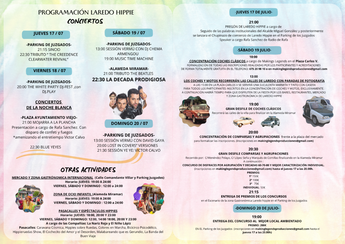 Laredo Hippie finalizará el domingo, 20 de julio, con una última jornada de pasacalles y espectáculos, además de tres sesiones musicales en el parking del Juzgado: a las 13:00h, DJ David Gaya ofrecerá una nueva sesión vermú; a las 20:00h, será el turno del concierto de versiones de Lost in Covers; y a las 21:30h, la sesión ye-yé de Víctor Calvo pondrá el broche final al evento.