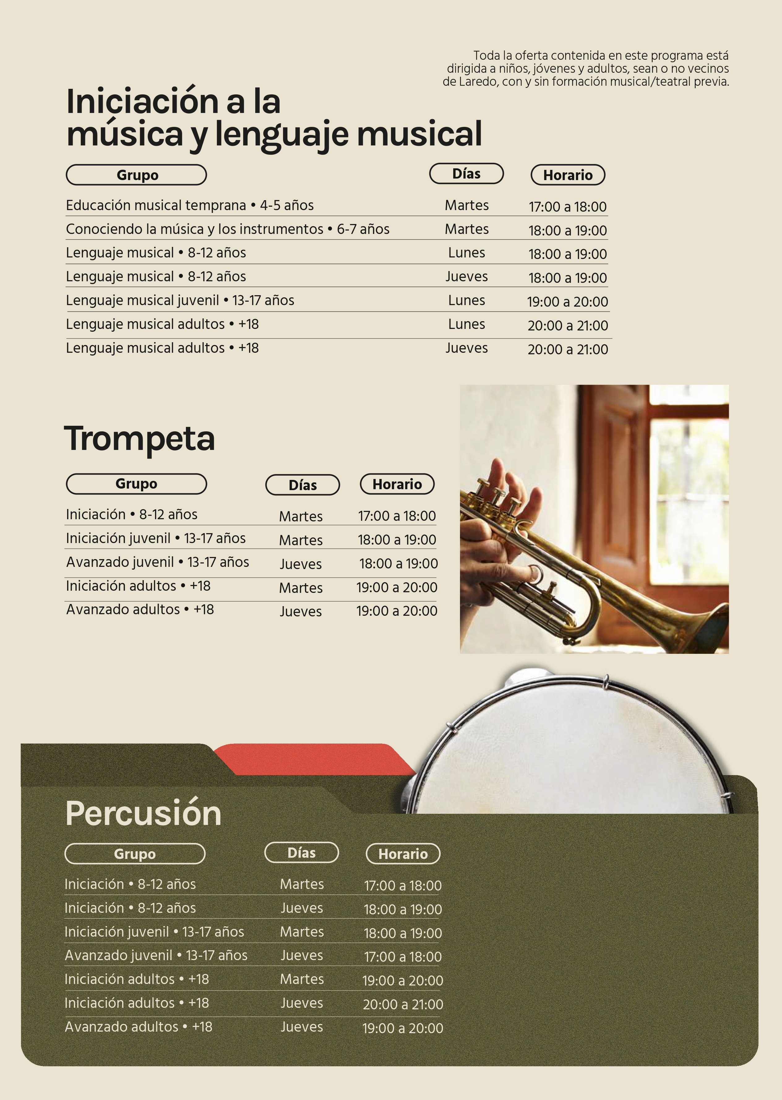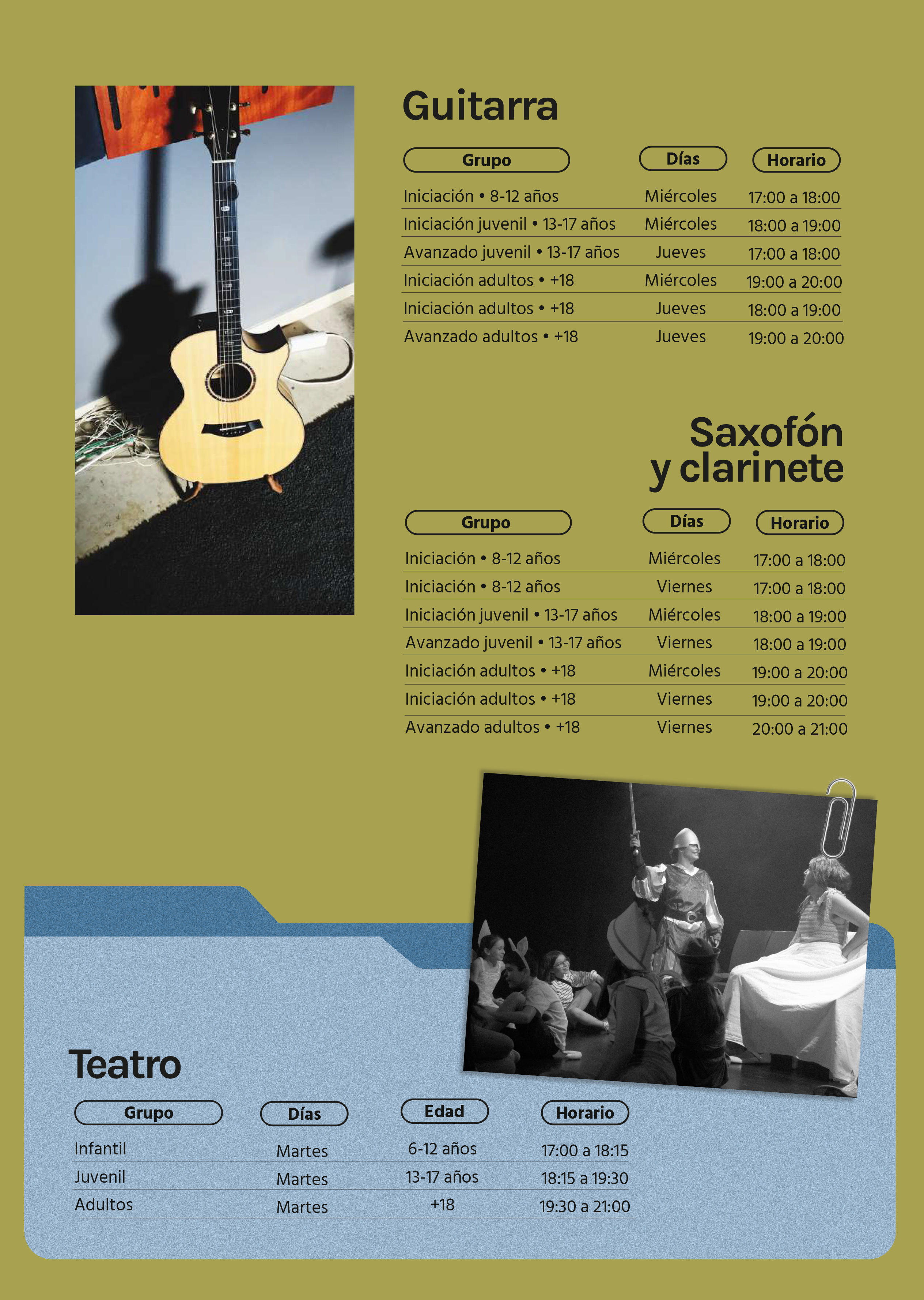 La formación, dirigida a personas de todas las edades y niveles, incluye clases de guitarra, percusión, saxofón, clarinete, violín, flauta, trompeta e iniciación a la música y lenguaje musical, mientras que en el área teatral se ofrecerá formación en interpretación, expresión corporal y expresión oral.