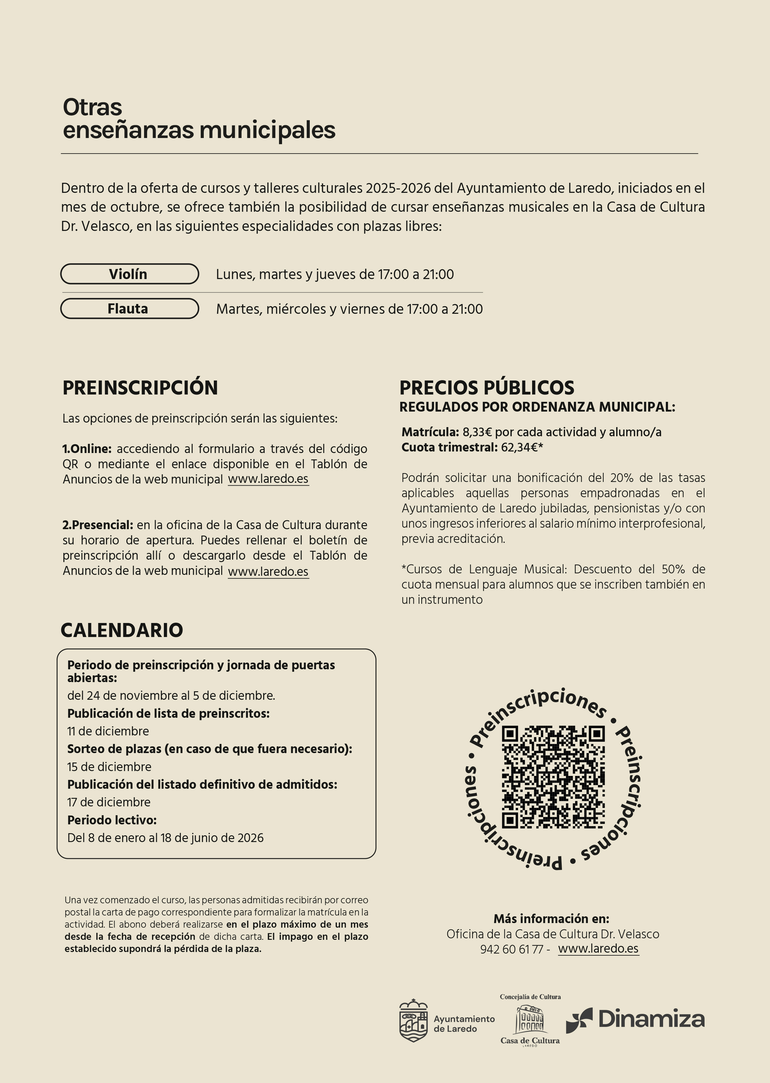 Para realizar la preinscripción, los interesados tienen dos opciones. Por un lado, de forma online accediendo al formulario a través del código QR disponible en el cartel informativo o mediante el enlace en el tablón de anuncios de la página web municipal (www.laredo.es). Por otro lado, de manera presencial en la Casa de Cultura Doctor Velasco, donde se podrá cumplimentar el formulario, que también puede descargarse previamente desde la web.