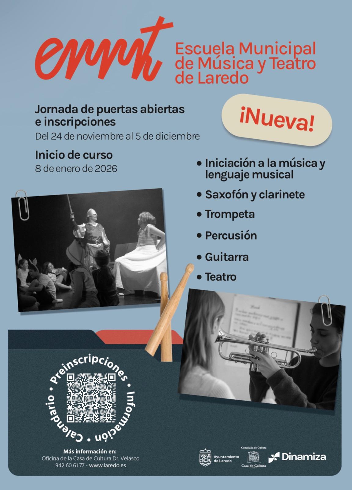 El Ayuntamiento de Laredo ha anunciado hoy en rueda de prensa la puesta en marcha de la nueva Escuela Municipal de Música y Teatro, que comenzará su actividad el próximo 24 de noviembre en la Casa de Cultura Doctor Velasco bajo la gestión de la empresa Dinamiza. Con esta iniciativa, el municipio recupera la formación musical y teatral tras muchos años sin ofrecer este servicio, con algunas disciplinas ausentes desde hace más de dos décadas.