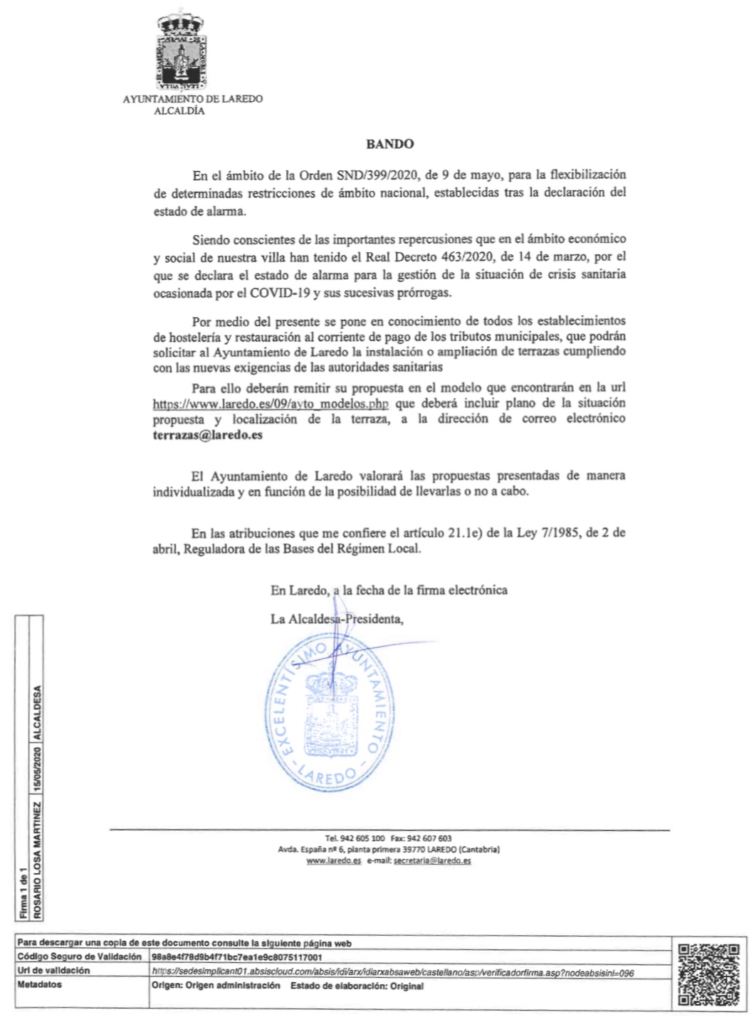 Se pone en conocimiento de todos los establecimientos de hostelería y restauración, al corriente de pago de los tributos municipales, que podrán solicitar al Ayuntamiento de Laredo la instalación o ampliación de terrazas cumpliendo con las exigencias de las autoridades sanitarias.