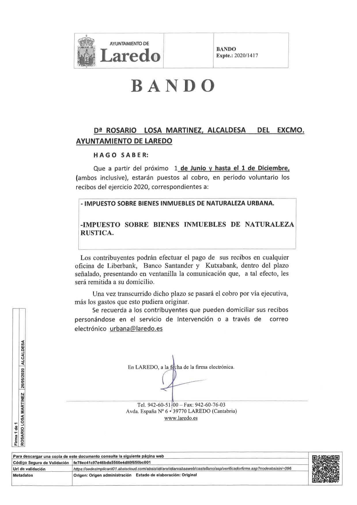 Se notifica que, a partir del próximo 1 de junio y hasta el 1 de diciembre ambos inclusive, estarán puestos al cobro en periodo voluntario los recibos del ejercicio 2020 correspondientes a: