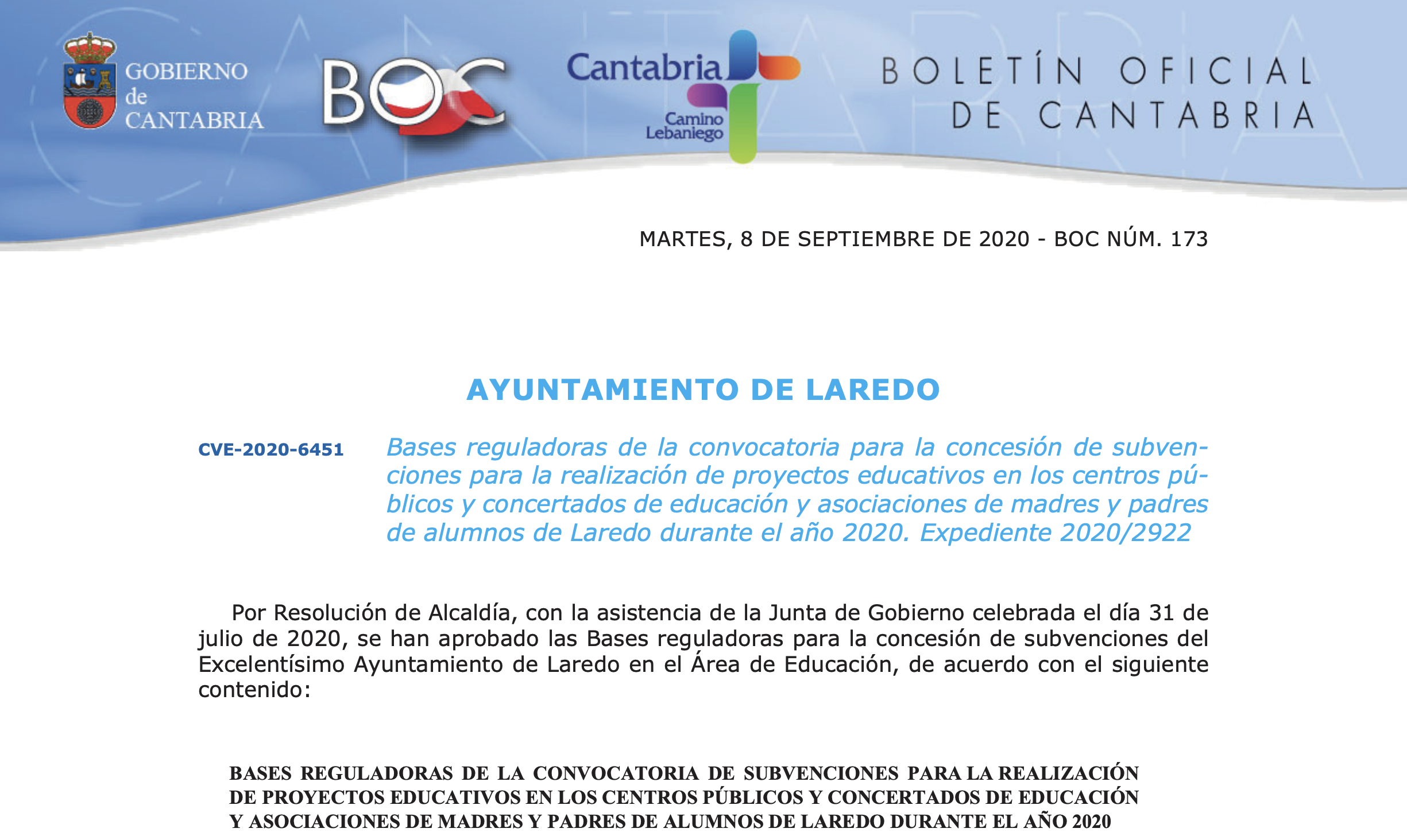 Se dan a conocer las bases reguladoras de la convocatoria para la concesión de subvenciones para la realización de proyectos educativos en los centros públicos y concertados de educación y asociaciones de madres y padres de alumnos de Laredo durante el año 2020. Expediente 2020/2922