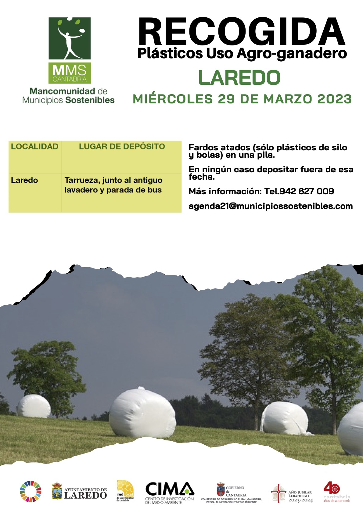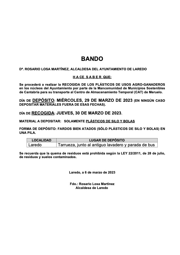 Se procederá a realizar la RECOGIDA DE LOS PLÁSTICOS DE USO AGRO-GANADERO en los núcleos del Ayuntamiento por parte de la Mancomunidad de Municipios Sostenibles de Cantabria para su transporte y procesamiento en la Planta de Tratamiento de Residuos de Meruelo. El 29 de marzo deberán depositarse los desechos para su recogida al día siguiente. Puedes leer todos los detalles aquí.