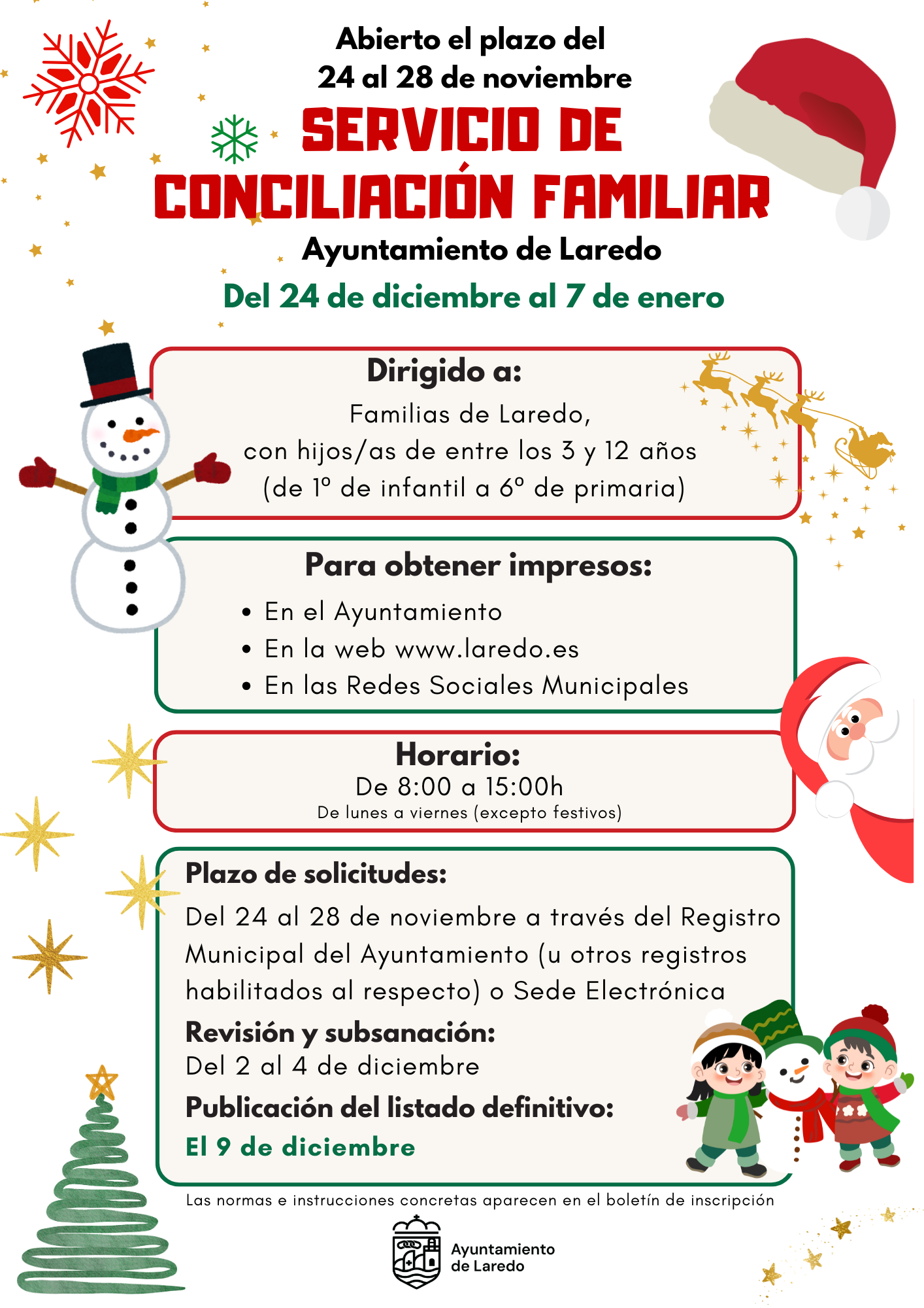 El Servicio de Conciliación Familiar y Laboral del período no lectivo de Navidad se realizará del miércoles 24 de diciembre hasta el miércoles 7 de enero de 2026 (ambos incluidos) entre las 8:00 y 15:00h, de lunes a viernes, excepto días festivos.
