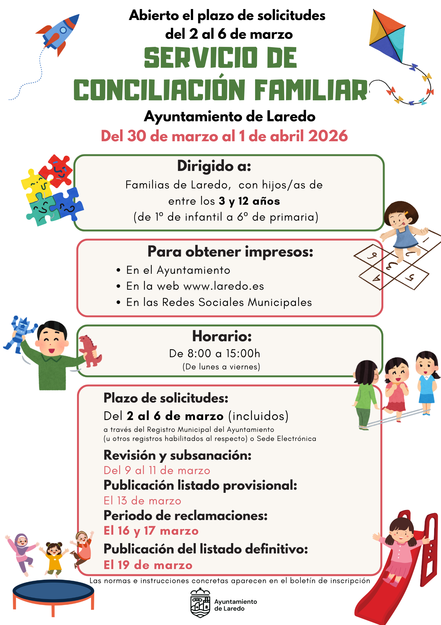 La población destinataria son niñas y niños de entre 3 y 12 años que cursen estudios entre 1º de.Infantil (no Aulas de 2 años) y 6º de Primaria, que estén empadronados/as en el municipio de Laredo con al menos 6 meses de antelación con alguno de los padres/s, madre/s o tutores/as legales y que estén en activo laboral todos/as sus representantes legales (padre/s, madre/s o tutores/as).