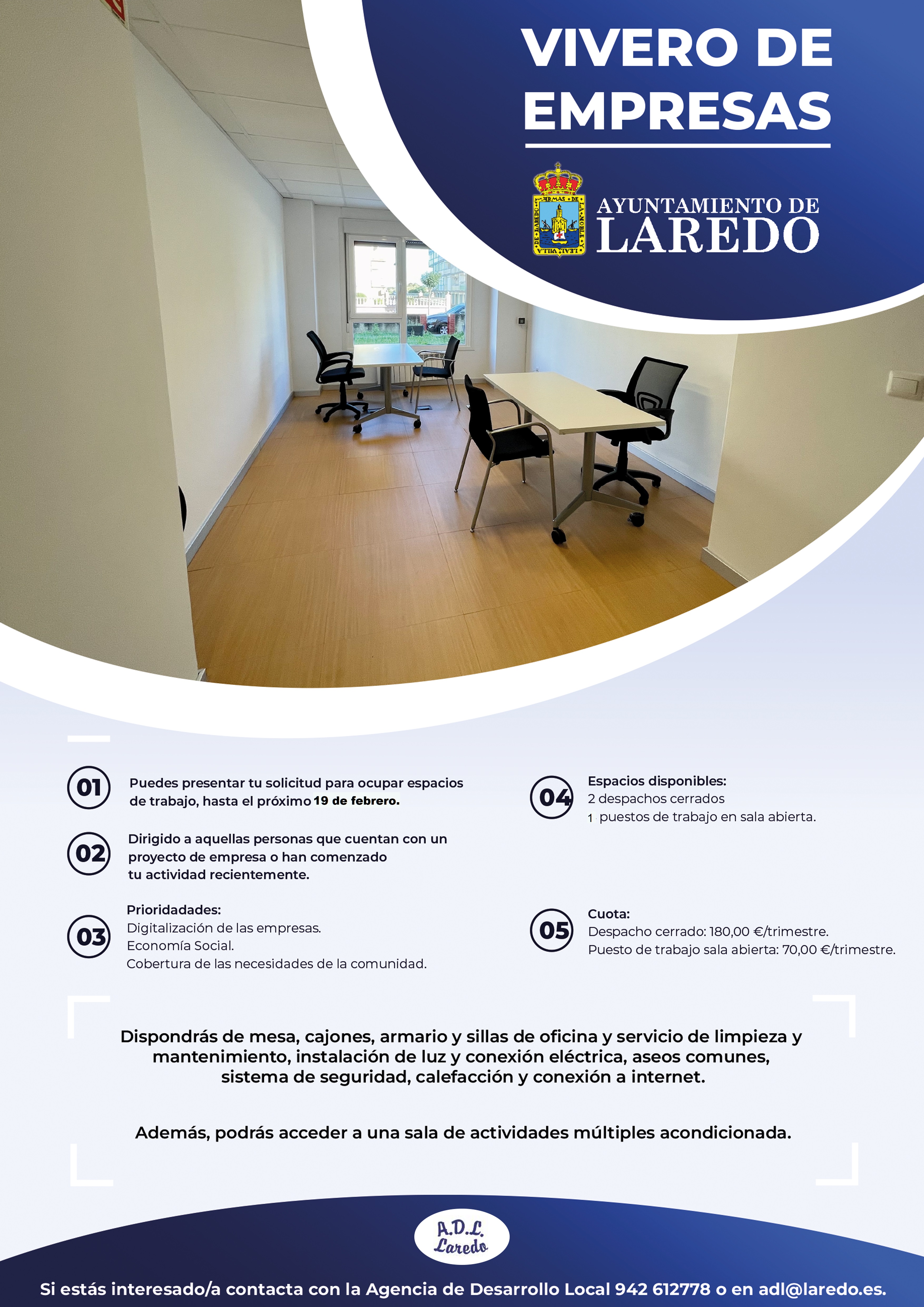 El Ayuntamiento de Laredo, pone a disposición de todas aquellas personas que deseen desarrollar un proyecto empresarial un Vivero de Empresas, con la intención de apoyar la cultura del emprendimiento y para impulsar la economía social.