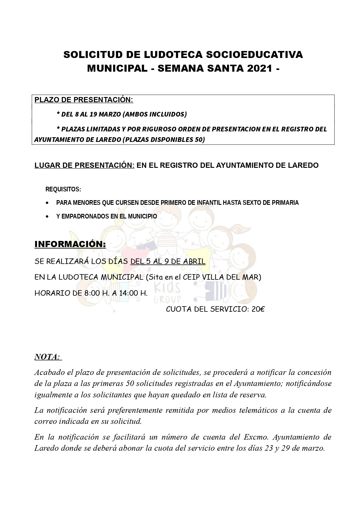 Desde el martes día 9 y hasta el próximo día 19 de marzo incluido, se podrá presentar ante el Registro del ayuntamiento de Laredo, el documento de preinscripción de solicitudes para acceder al servicio de Ludoteca Socioeducativa municipal que se habilitará en las dependencias de la ludoteca municipal del CEIP Villa del Mar, entre los días 5 y 9 de abril próximo, coincidiendo con el período vacacional de Semana Santa.